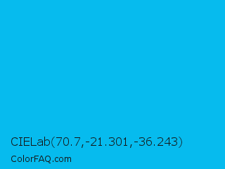 CIELab 70.7,-21.301,-36.243 Color is a normal cyan color and the nearest color is Cyan Process #00b7eb. Hex code #06bbee and RGB value is rgb(6,187,238). In RGB color space, this color is composed of 2% red, 73% green, 93% blue, In CMYK color space, this color is composed of 97% cyan, 21% magenta, 0% yellow , 7% black , In HSL color space, this color has a hue angle of 193° , 95% saturation and 48% lightness.