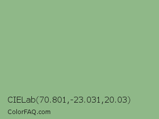 CIELab 70.801,-23.031,20.03 Color is a light green color and the nearest color is Dark Sea Green #8fbc8f. Hex code #8fb888 and RGB value is rgb(143,184,136). In RGB color space, this color is composed of 56% red, 72% green, 53% blue, In CMYK color space, this color is composed of 22% cyan, 0% magenta, 26% yellow , 28% black , In HSL color space, this color has a hue angle of 111° , 25% saturation and 63% lightness.