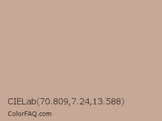 CIELab 70.809,7.24,13.588 Color is a light orange color and the nearest color is Indian Khaki #c3b091. Hex code #c4a895 and RGB value is rgb(196,168,149). In RGB color space, this color is composed of 77% red, 66% green, 58% blue, In CMYK color space, this color is composed of 0% cyan, 14% magenta, 24% yellow , 23% black , In HSL color space, this color has a hue angle of 24° , 28% saturation and 68% lightness.