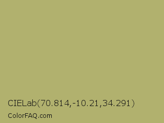 CIELab 70.814,-10.21,34.291 Color is a normal yellow color and the nearest color is Gimblet #b8b56a. Hex code #b1b16e and RGB value is rgb(177,177,110). In RGB color space, this color is composed of 69% red, 69% green, 43% blue, In CMYK color space, this color is composed of 0% cyan, 0% magenta, 38% yellow , 31% black , In HSL color space, this color has a hue angle of 60° , 30% saturation and 56% lightness.
