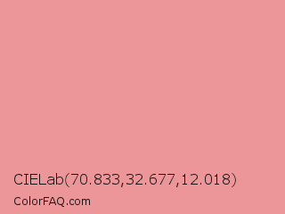 CIELab 70.833,32.677,12.018 Color is a light red color and the nearest color is Sea Pink #ed989e. Hex code #ec9699 and RGB value is rgb(236,150,153). In RGB color space, this color is composed of 93% red, 59% green, 60% blue, In CMYK color space, this color is composed of 0% cyan, 36% magenta, 35% yellow , 7% black , In HSL color space, this color has a hue angle of 358° , 69% saturation and 76% lightness.