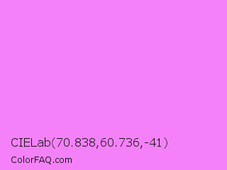 CIELab 70.838,60.736,-41 Color is a light magenta color and the nearest color is Light Fuchsia Pink #f984ef. Hex code #f581f9 and RGB value is rgb(245,129,249). In RGB color space, this color is composed of 96% red, 51% green, 98% blue, In CMYK color space, this color is composed of 2% cyan, 48% magenta, 0% yellow , 2% black , In HSL color space, this color has a hue angle of 298° , 91% saturation and 74% lightness.