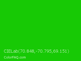 CIELab 70.848,-70.795,69.151 Color is a normal green color and the nearest color is Harlequin Green #46cb18. Hex code #17c905 and RGB value is rgb(23,201,5). In RGB color space, this color is composed of 9% red, 79% green, 2% blue, In CMYK color space, this color is composed of 89% cyan, 0% magenta, 98% yellow , 21% black , In HSL color space, this color has a hue angle of 114° , 95% saturation and 40% lightness.