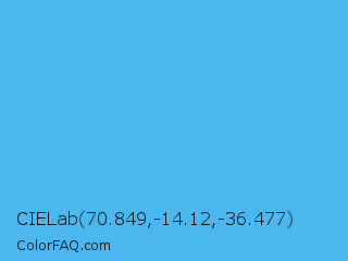 CIELab 70.849,-14.12,-36.477 Color is a light blue color and the nearest color is Picton Blue #45b1e8. Hex code #4ab8ef and RGB value is rgb(74,184,239). In RGB color space, this color is composed of 29% red, 72% green, 94% blue, In CMYK color space, this color is composed of 69% cyan, 23% magenta, 0% yellow , 6% black , In HSL color space, this color has a hue angle of 200° , 84% saturation and 61% lightness.