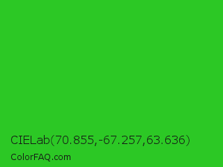 CIELab 70.855,-67.257,63.636 Color is a normal green color and the nearest color is Lime Green #32cd32. Hex code #2cc825 and RGB value is rgb(44,200,37). In RGB color space, this color is composed of 17% red, 78% green, 15% blue, In CMYK color space, this color is composed of 78% cyan, 0% magenta, 82% yellow , 22% black , In HSL color space, this color has a hue angle of 117° , 69% saturation and 46% lightness.