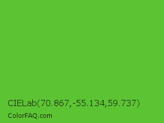 CIELab 70.867,-55.134,59.737 Color is a normal green color and the nearest color is Green RYB #66b032. Hex code #5cc433 and RGB value is rgb(92,196,51). In RGB color space, this color is composed of 36% red, 77% green, 20% blue, In CMYK color space, this color is composed of 53% cyan, 0% magenta, 74% yellow , 23% black , In HSL color space, this color has a hue angle of 103° , 59% saturation and 48% lightness.