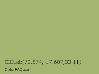 CIELab 70.874,-17.607,33.11 Color is a normal lime color and the nearest color is Green Smoke #a4af6e. Hex code #a3b570 and RGB value is rgb(163,181,112). In RGB color space, this color is composed of 64% red, 71% green, 44% blue, In CMYK color space, this color is composed of 10% cyan, 0% magenta, 38% yellow , 29% black , In HSL color space, this color has a hue angle of 76° , 32% saturation and 57% lightness.