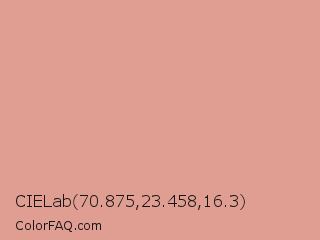CIELab 70.875,23.458,16.3 Color is a light red color and the nearest color is Petite Orchid #db9690. Hex code #e09d91 and RGB value is rgb(224,157,145). In RGB color space, this color is composed of 88% red, 62% green, 57% blue, In CMYK color space, this color is composed of 0% cyan, 30% magenta, 35% yellow , 12% black , In HSL color space, this color has a hue angle of 9° , 56% saturation and 72% lightness.
