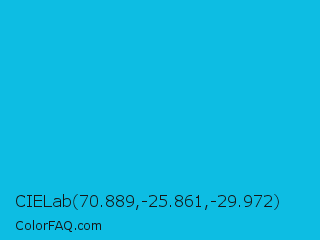 CIELab 70.889,-25.861,-29.972 Color is a normal cyan color and the nearest color is Cyan Process #00b7eb. Hex code #0dbde3 and RGB value is rgb(13,189,227). In RGB color space, this color is composed of 5% red, 74% green, 89% blue, In CMYK color space, this color is composed of 94% cyan, 17% magenta, 0% yellow , 11% black , In HSL color space, this color has a hue angle of 191° , 89% saturation and 47% lightness.