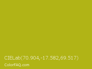 CIELab 70.904,-17.582,69.517 Color is a normal yellow color and the nearest color is Acid Green #b0bf1a. Hex code #b1b416 and RGB value is rgb(177,180,22). In RGB color space, this color is composed of 69% red, 71% green, 9% blue, In CMYK color space, this color is composed of 2% cyan, 0% magenta, 88% yellow , 29% black , In HSL color space, this color has a hue angle of 61° , 78% saturation and 40% lightness.
