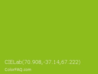 CIELab 70.908,-37.14,67.222 Color is a normal lime color and the nearest color is Lima #76bd17. Hex code #8cbd1c and RGB value is rgb(140,189,28). In RGB color space, this color is composed of 55% red, 74% green, 11% blue, In CMYK color space, this color is composed of 26% cyan, 0% magenta, 85% yellow , 26% black , In HSL color space, this color has a hue angle of 78° , 74% saturation and 43% lightness.