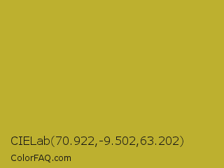 CIELab 70.922,-9.502,63.202 Color is a normal yellow color and the nearest color is Hokey Pokey #c8a528. Hex code #bdb02f and RGB value is rgb(189,176,47). In RGB color space, this color is composed of 74% red, 69% green, 18% blue, In CMYK color space, this color is composed of 0% cyan, 7% magenta, 75% yellow , 26% black , In HSL color space, this color has a hue angle of 55° , 60% saturation and 46% lightness.