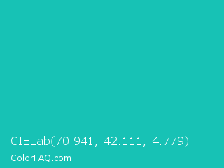 CIELab 70.941,-42.111,-4.779 Color is a normal cyan color and the nearest color is Tiffany Blue #0abab5. Hex code #17c2b5 and RGB value is rgb(23,194,181). In RGB color space, this color is composed of 9% red, 76% green, 71% blue, In CMYK color space, this color is composed of 88% cyan, 0% magenta, 7% yellow , 24% black , In HSL color space, this color has a hue angle of 175° , 79% saturation and 43% lightness.