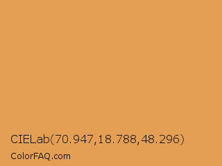 CIELab 70.947,18.788,48.296 Color is a light orange color and the nearest color is Indian Yellow #e3a857. Hex code #e59f55 and RGB value is rgb(229,159,85). In RGB color space, this color is composed of 90% red, 62% green, 33% blue, In CMYK color space, this color is composed of 0% cyan, 31% magenta, 63% yellow , 10% black , In HSL color space, this color has a hue angle of 31° , 73% saturation and 62% lightness.