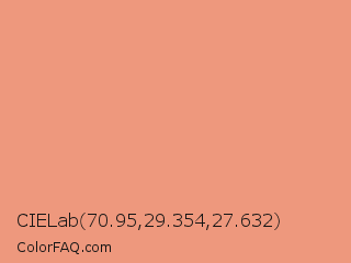 CIELab 70.95,29.354,27.632 Color is a light red color and the nearest color is Dark Salmon #e9967a. Hex code #ee987d and RGB value is rgb(238,152,125). In RGB color space, this color is composed of 93% red, 60% green, 49% blue, In CMYK color space, this color is composed of 0% cyan, 36% magenta, 47% yellow , 7% black , In HSL color space, this color has a hue angle of 14° , 77% saturation and 71% lightness.