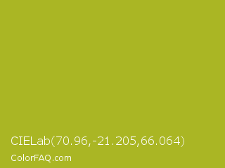 CIELab 70.96,-21.205,66.064 Color is a normal yellow color and the nearest color is Acid Green #b0bf1a. Hex code #aab624 and RGB value is rgb(170,182,36). In RGB color space, this color is composed of 67% red, 71% green, 14% blue, In CMYK color space, this color is composed of 7% cyan, 0% magenta, 80% yellow , 29% black , In HSL color space, this color has a hue angle of 65° , 67% saturation and 43% lightness.