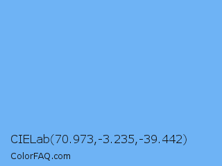 CIELab 70.973,-3.235,-39.442 Color is a light blue color and the nearest color is Very Light Azure #74bbfb. Hex code #6eb3f5 and RGB value is rgb(110,179,245). In RGB color space, this color is composed of 43% red, 70% green, 96% blue, In CMYK color space, this color is composed of 55% cyan, 27% magenta, 0% yellow , 4% black , In HSL color space, this color has a hue angle of 209° , 87% saturation and 70% lightness.