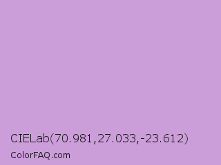 CIELab 70.981,27.033,-23.612 Color is a light purple color and the nearest color is Light Wisteria #c9a0dc. Hex code #cb9ed9 and RGB value is rgb(203,158,217). In RGB color space, this color is composed of 80% red, 62% green, 85% blue, In CMYK color space, this color is composed of 6% cyan, 27% magenta, 0% yellow , 15% black , In HSL color space, this color has a hue angle of 286° , 44% saturation and 74% lightness.