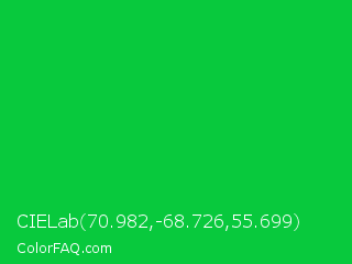 CIELab 70.982,-68.726,55.699 Color is a normal green color and the nearest color is Dark Pastel Green #03c03c. Hex code #08c93d and RGB value is rgb(8,201,61). In RGB color space, this color is composed of 3% red, 79% green, 24% blue, In CMYK color space, this color is composed of 96% cyan, 0% magenta, 70% yellow , 21% black , In HSL color space, this color has a hue angle of 136° , 92% saturation and 41% lightness.