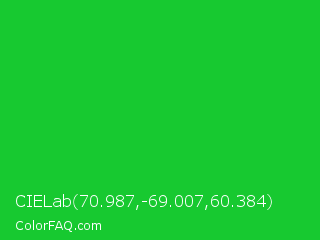 CIELab 70.987,-69.007,60.384 Color is a normal green color and the nearest color is Vivid Malachite #00cc33. Hex code #17c930 and RGB value is rgb(23,201,48). In RGB color space, this color is composed of 9% red, 79% green, 19% blue, In CMYK color space, this color is composed of 89% cyan, 0% magenta, 76% yellow , 21% black , In HSL color space, this color has a hue angle of 128° , 79% saturation and 44% lightness.