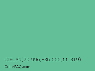 CIELab 70.996,-36.666,11.319 Color is a normal green color and the nearest color is Silver Tree #66b58f. Hex code #63bf98 and RGB value is rgb(99,191,152). In RGB color space, this color is composed of 39% red, 75% green, 60% blue, In CMYK color space, this color is composed of 48% cyan, 0% magenta, 20% yellow , 25% black , In HSL color space, this color has a hue angle of 155° , 42% saturation and 57% lightness.