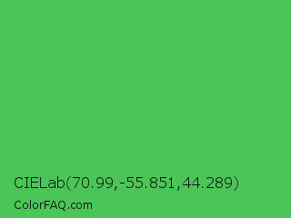 CIELab 70.99,-55.851,44.289 Color is a normal green color and the nearest color is UFO Green #3cd070. Hex code #4cc558 and RGB value is rgb(76,197,88). In RGB color space, this color is composed of 30% red, 77% green, 35% blue, In CMYK color space, this color is composed of 61% cyan, 0% magenta, 55% yellow , 23% black , In HSL color space, this color has a hue angle of 126° , 51% saturation and 54% lightness.