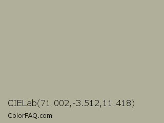 CIELab 71.002,-3.512,11.418 Color is a light yellow color and the nearest color is Taupe Gray #b3af95. Hex code #b0af99 and RGB value is rgb(176,175,153). In RGB color space, this color is composed of 69% red, 69% green, 60% blue, In CMYK color space, this color is composed of 0% cyan, 1% magenta, 13% yellow , 31% black , In HSL color space, this color has a hue angle of 57° , 13% saturation and 65% lightness.