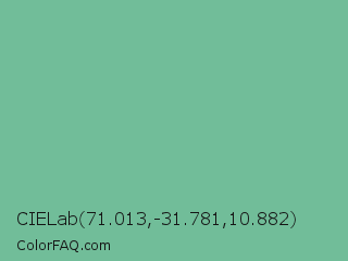 CIELab 71.013,-31.781,10.882 Color is a normal green color and the nearest color is Silver Tree #66b58f. Hex code #71bd99 and RGB value is rgb(113,189,153). In RGB color space, this color is composed of 44% red, 74% green, 60% blue, In CMYK color space, this color is composed of 40% cyan, 0% magenta, 19% yellow , 26% black , In HSL color space, this color has a hue angle of 152° , 37% saturation and 59% lightness.