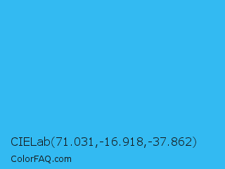 CIELab 71.031,-16.918,-37.862 Color is a normal blue color and the nearest color is Picton Blue #45b1e8. Hex code #33baf2 and RGB value is rgb(51,186,242). In RGB color space, this color is composed of 20% red, 73% green, 95% blue, In CMYK color space, this color is composed of 79% cyan, 23% magenta, 0% yellow , 5% black , In HSL color space, this color has a hue angle of 198° , 88% saturation and 57% lightness.