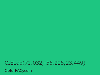 CIELab 71.032,-56.225,23.449 Color is a normal green color and the nearest color is Mountain Meadow Crayola #1ab385. Hex code #1dc681 and RGB value is rgb(29,198,129). In RGB color space, this color is composed of 11% red, 78% green, 51% blue, In CMYK color space, this color is composed of 85% cyan, 0% magenta, 35% yellow , 22% black , In HSL color space, this color has a hue angle of 156° , 74% saturation and 45% lightness.