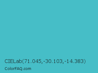 CIELab 71.045,-30.103,-14.383 Color is a normal cyan color and the nearest color is Sea Serpent #4bc7cf. Hex code #46bec7 and RGB value is rgb(70,190,199). In RGB color space, this color is composed of 27% red, 75% green, 78% blue, In CMYK color space, this color is composed of 65% cyan, 5% magenta, 0% yellow , 22% black , In HSL color space, this color has a hue angle of 184° , 54% saturation and 53% lightness.
