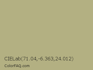CIELab 71.04,-6.363,24.012 Color is a light yellow color and the nearest color is Hillary #aca586. Hex code #b3b082 and RGB value is rgb(179,176,130). In RGB color space, this color is composed of 70% red, 69% green, 51% blue, In CMYK color space, this color is composed of 0% cyan, 2% magenta, 27% yellow , 30% black , In HSL color space, this color has a hue angle of 56° , 24% saturation and 61% lightness.