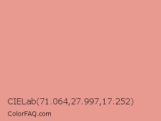 CIELab 71.064,27.997,17.252 Color is a light red color and the nearest color is Tonys Pink #e79f8c. Hex code #e89a90 and RGB value is rgb(232,154,144). In RGB color space, this color is composed of 91% red, 60% green, 56% blue, In CMYK color space, this color is composed of 0% cyan, 34% magenta, 38% yellow , 9% black , In HSL color space, this color has a hue angle of 7° , 66% saturation and 74% lightness.
