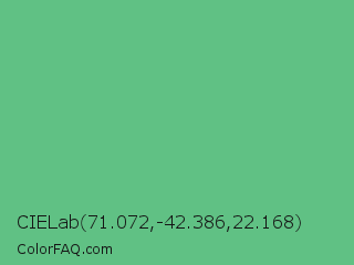 CIELab 71.072,-42.386,22.168 Color is a normal green color and the nearest color is Silver Tree #66b58f. Hex code #60c184 and RGB value is rgb(96,193,132). In RGB color space, this color is composed of 38% red, 76% green, 52% blue, In CMYK color space, this color is composed of 50% cyan, 0% magenta, 32% yellow , 24% black , In HSL color space, this color has a hue angle of 142° , 44% saturation and 57% lightness.