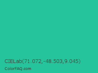 CIELab 71.072,-48.503,9.045 Color is a normal cyan color and the nearest color is Shamrock #33cc99. Hex code #26c49c and RGB value is rgb(38,196,156). In RGB color space, this color is composed of 15% red, 77% green, 61% blue, In CMYK color space, this color is composed of 81% cyan, 0% magenta, 20% yellow , 23% black , In HSL color space, this color has a hue angle of 165° , 68% saturation and 46% lightness.