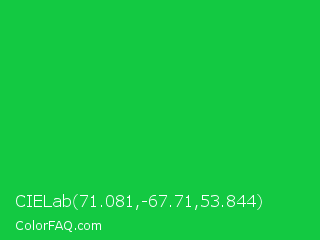 CIELab 71.081,-67.71,53.844 Color is a normal green color and the nearest color is Dark Pastel Green #03c03c. Hex code #13c942 and RGB value is rgb(19,201,66). In RGB color space, this color is composed of 7% red, 79% green, 26% blue, In CMYK color space, this color is composed of 91% cyan, 0% magenta, 67% yellow , 21% black , In HSL color space, this color has a hue angle of 135° , 83% saturation and 43% lightness.