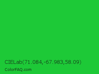 CIELab 71.084,-67.983,58.09 Color is a normal green color and the nearest color is Lime Green #32cd32. Hex code #1dc937 and RGB value is rgb(29,201,55). In RGB color space, this color is composed of 11% red, 79% green, 22% blue, In CMYK color space, this color is composed of 86% cyan, 0% magenta, 73% yellow , 21% black , In HSL color space, this color has a hue angle of 129° , 75% saturation and 45% lightness.
