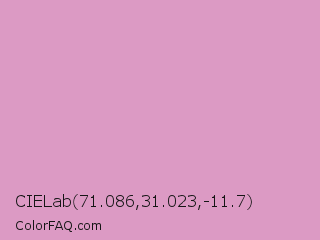 CIELab 71.086,31.023,-11.7 Color is a light magenta color and the nearest color is Shocking #e292c0. Hex code #dc9ac4 and RGB value is rgb(220,154,196). In RGB color space, this color is composed of 86% red, 60% green, 77% blue, In CMYK color space, this color is composed of 0% cyan, 30% magenta, 11% yellow , 14% black , In HSL color space, this color has a hue angle of 322° , 49% saturation and 73% lightness.