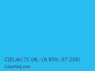 CIELab 71.08,-18.859,-37.259 Color is a normal blue color and the nearest color is Spiro Disco Ball #0fc0fc. Hex code #26bbf1 and RGB value is rgb(38,187,241). In RGB color space, this color is composed of 15% red, 73% green, 95% blue, In CMYK color space, this color is composed of 84% cyan, 22% magenta, 0% yellow , 5% black , In HSL color space, this color has a hue angle of 196° , 88% saturation and 55% lightness.