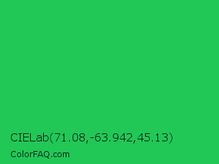 CIELab 71.08,-63.942,45.13 Color is a normal green color and the nearest color is Malachite #0bda51. Hex code #21c856 and RGB value is rgb(33,200,86). In RGB color space, this color is composed of 13% red, 78% green, 34% blue, In CMYK color space, this color is composed of 84% cyan, 0% magenta, 57% yellow , 22% black , In HSL color space, this color has a hue angle of 139° , 72% saturation and 46% lightness.