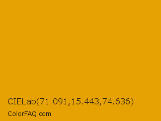 CIELab 71.091,15.443,74.636 Color is a normal orange color and the nearest color is Gamboge #e49b0f. Hex code #e6a103 and RGB value is rgb(230,161,3). In RGB color space, this color is composed of 90% red, 63% green, 1% blue, In CMYK color space, this color is composed of 0% cyan, 30% magenta, 99% yellow , 10% black , In HSL color space, this color has a hue angle of 42° , 97% saturation and 46% lightness.