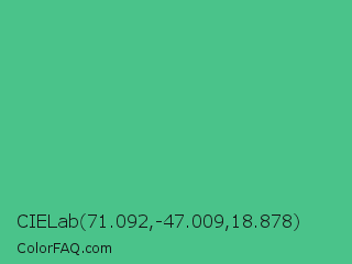 CIELab 71.092,-47.009,18.878 Color is a normal green color and the nearest color is Ocean Green #48bf91. Hex code #4ac38a and RGB value is rgb(74,195,138). In RGB color space, this color is composed of 29% red, 76% green, 54% blue, In CMYK color space, this color is composed of 62% cyan, 0% magenta, 29% yellow , 24% black , In HSL color space, this color has a hue angle of 152° , 50% saturation and 53% lightness.