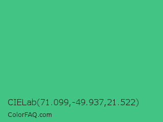 CIELab 71.099,-49.937,21.522 Color is a normal green color and the nearest color is Ocean Green #48bf91. Hex code #42c485 and RGB value is rgb(66,196,133). In RGB color space, this color is composed of 26% red, 77% green, 52% blue, In CMYK color space, this color is composed of 66% cyan, 0% magenta, 32% yellow , 23% black , In HSL color space, this color has a hue angle of 151° , 52% saturation and 51% lightness.