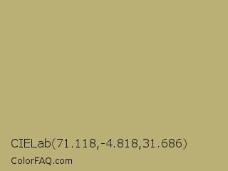 CIELab 71.118,-4.818,31.686 Color is a normal yellow color and the nearest color is Misty Moss #bbb477. Hex code #baaf74 and RGB value is rgb(186,175,116). In RGB color space, this color is composed of 73% red, 69% green, 45% blue, In CMYK color space, this color is composed of 0% cyan, 6% magenta, 38% yellow , 27% black , In HSL color space, this color has a hue angle of 51° , 34% saturation and 59% lightness.