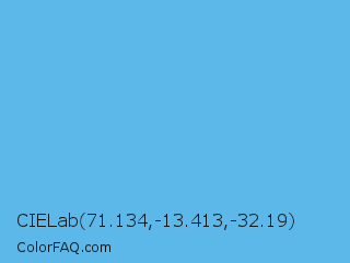 CIELab 71.134,-13.413,-32.19 Color is a light blue color and the nearest color is Blue Jeans #5dadec. Hex code #5cb8e8 and RGB value is rgb(92,184,232). In RGB color space, this color is composed of 36% red, 72% green, 91% blue, In CMYK color space, this color is composed of 60% cyan, 21% magenta, 0% yellow , 9% black , In HSL color space, this color has a hue angle of 201° , 75% saturation and 64% lightness.