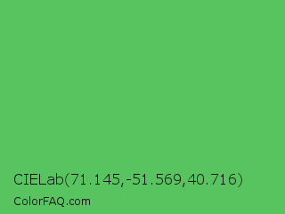 CIELab 71.145,-51.569,40.716 Color is a normal green color and the nearest color is Fern #63b76c. Hex code #58c460 and RGB value is rgb(88,196,96). In RGB color space, this color is composed of 35% red, 77% green, 38% blue, In CMYK color space, this color is composed of 55% cyan, 0% magenta, 51% yellow , 23% black , In HSL color space, this color has a hue angle of 124° , 48% saturation and 56% lightness.