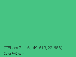 CIELab 71.16,-49.613,22.683 Color is a normal green color and the nearest color is Ocean Green #48bf91. Hex code #46c483 and RGB value is rgb(70,196,131). In RGB color space, this color is composed of 27% red, 77% green, 51% blue, In CMYK color space, this color is composed of 64% cyan, 0% magenta, 33% yellow , 23% black , In HSL color space, this color has a hue angle of 149° , 52% saturation and 52% lightness.