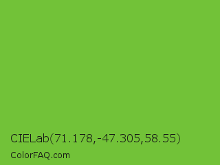 CIELab 71.178,-47.305,58.55 Color is a normal green color and the nearest color is Green RYB #66b032. Hex code #72c238 and RGB value is rgb(114,194,56). In RGB color space, this color is composed of 45% red, 76% green, 22% blue, In CMYK color space, this color is composed of 41% cyan, 0% magenta, 71% yellow , 24% black , In HSL color space, this color has a hue angle of 95° , 55% saturation and 49% lightness.