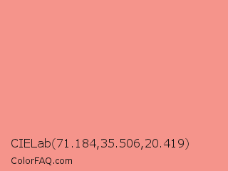CIELab 71.184,35.506,20.419 Color is a light red color and the nearest color is Geraldine #fb8989. Hex code #f5948b and RGB value is rgb(245,148,139). In RGB color space, this color is composed of 96% red, 58% green, 55% blue, In CMYK color space, this color is composed of 0% cyan, 40% magenta, 43% yellow , 4% black , In HSL color space, this color has a hue angle of 5° , 84% saturation and 75% lightness.