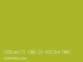 CIELab 71.188,-21.937,64.788 Color is a normal yellow color and the nearest color is Acid Green #b0bf1a. Hex code #a9b729 and RGB value is rgb(169,183,41). In RGB color space, this color is composed of 66% red, 72% green, 16% blue, In CMYK color space, this color is composed of 8% cyan, 0% magenta, 78% yellow , 28% black , In HSL color space, this color has a hue angle of 66° , 63% saturation and 44% lightness.